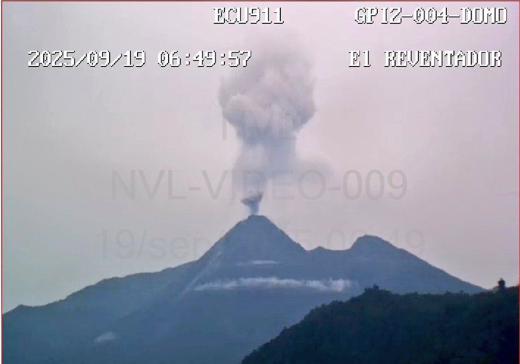 Este viernes 19 de septiembre de 2025, las cámaras de videovigilancia del ECU 911, captaron la emisión de material piroclástico en el volcán Reventador, ubicado entre las provincias de Napo y Sucumbíos.