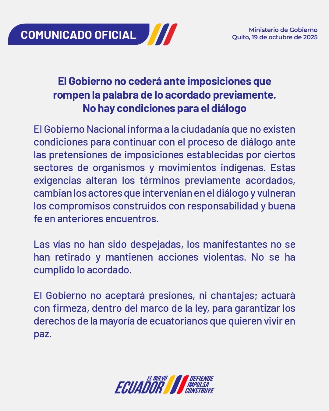 El pasado domingo 19 de octubre de 2025, el presidente Daniel Noboa anunció, mediante un comunicado oficial, que su gobierno no continuará con el proceso de diálogo con el movimiento indígena y organizaciones sociales, argumentando que “no existen las condiciones necesarias”.