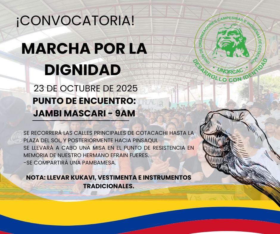 Asimismo, la UNORCAC hizo un llamado a sus comunidades y organizaciones aliadas a unirse a la “marcha masiva por la dignidad”, la cual se lleva a cabo desde las primeras horas de este jueves 23 de octubre de 2025 en Cotacachi. La movilización busca reafirmar el compromiso de las comunidades con la defensa de sus derechos y mantener viva la resistencia frente a lo que consideran un incumplimiento del Gobierno Nacional.