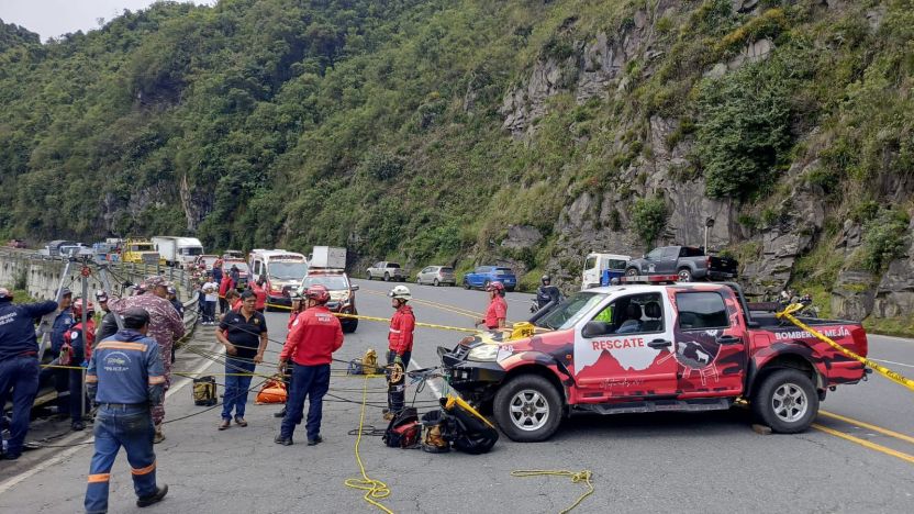 Hasta el sitio acudieron miembros del Cuerpo de Bomberos del Cantón Mejía, quienes inspeccionaron la zona mediante vigilancia con drones. Además, equipos especializados descendieron para verificar la situación del vehículo y ejecutar las labores de rescate correspondientes.